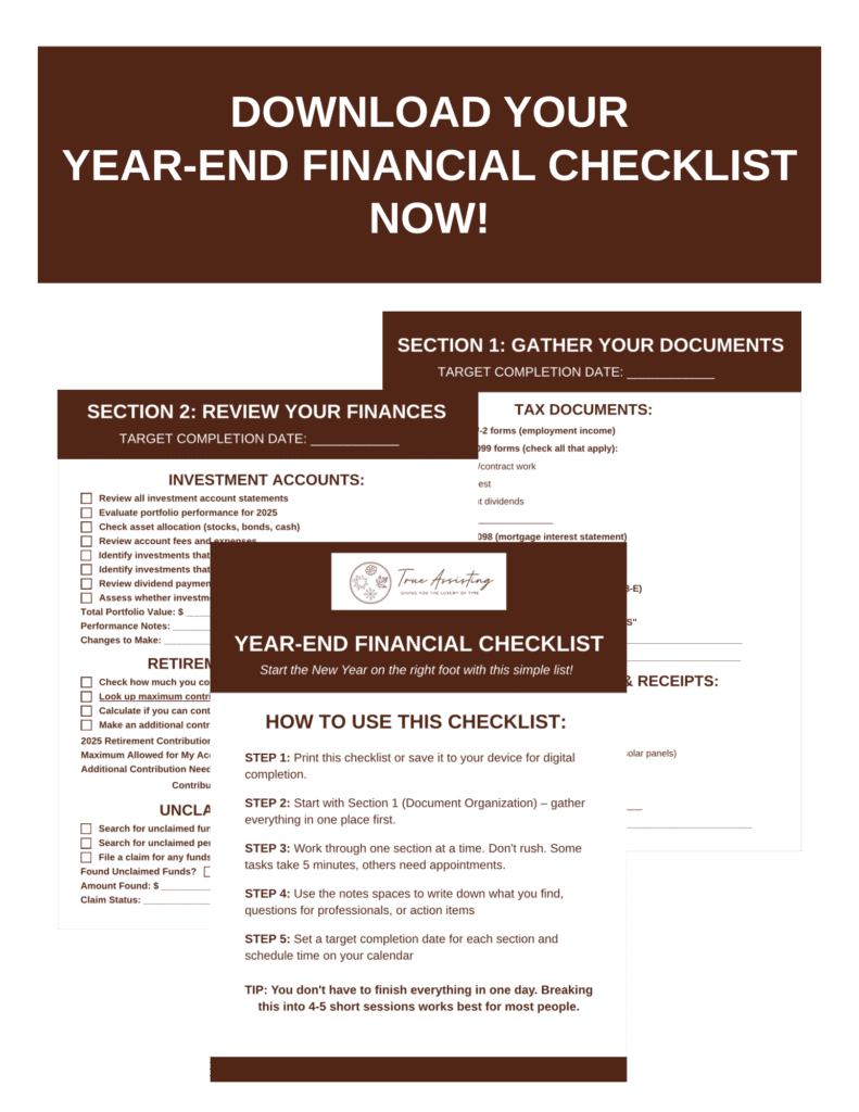 The end of the year is the perfect time to pause, get organized, and make sure nothing important slips through the cracks. This Year-End Financial Checklist walks you step by step through gathering documents, reviewing your finances, scheduling key appointments, and planning ahead for the year to come.